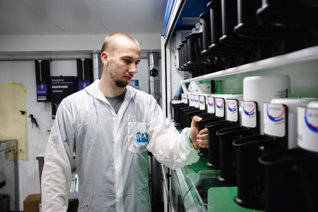 - Automatische kleurmenging met Moonwalk PPG: Dankzij het Moonwalk-systeem van PPG mengen we lakken automatisch en met uiterste precisie. Minder verspilling, geen menselijke fouten en altijd een perfecte kleurmatch.